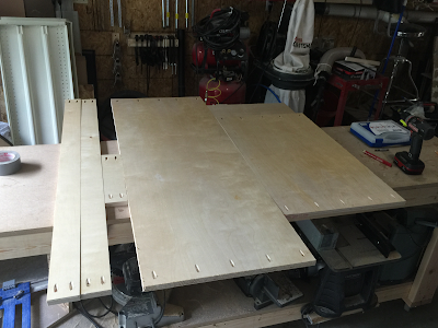 Here we have the cabinet all screwed together. I had Stacey help me to make it easier. If she wasn't around I would have used clamps to hold the pieces together. At this point, I put the basket frames in and measured again to make sure everything was going to fit. Lo and behold I was off about 1/16" on each side (womp womp).