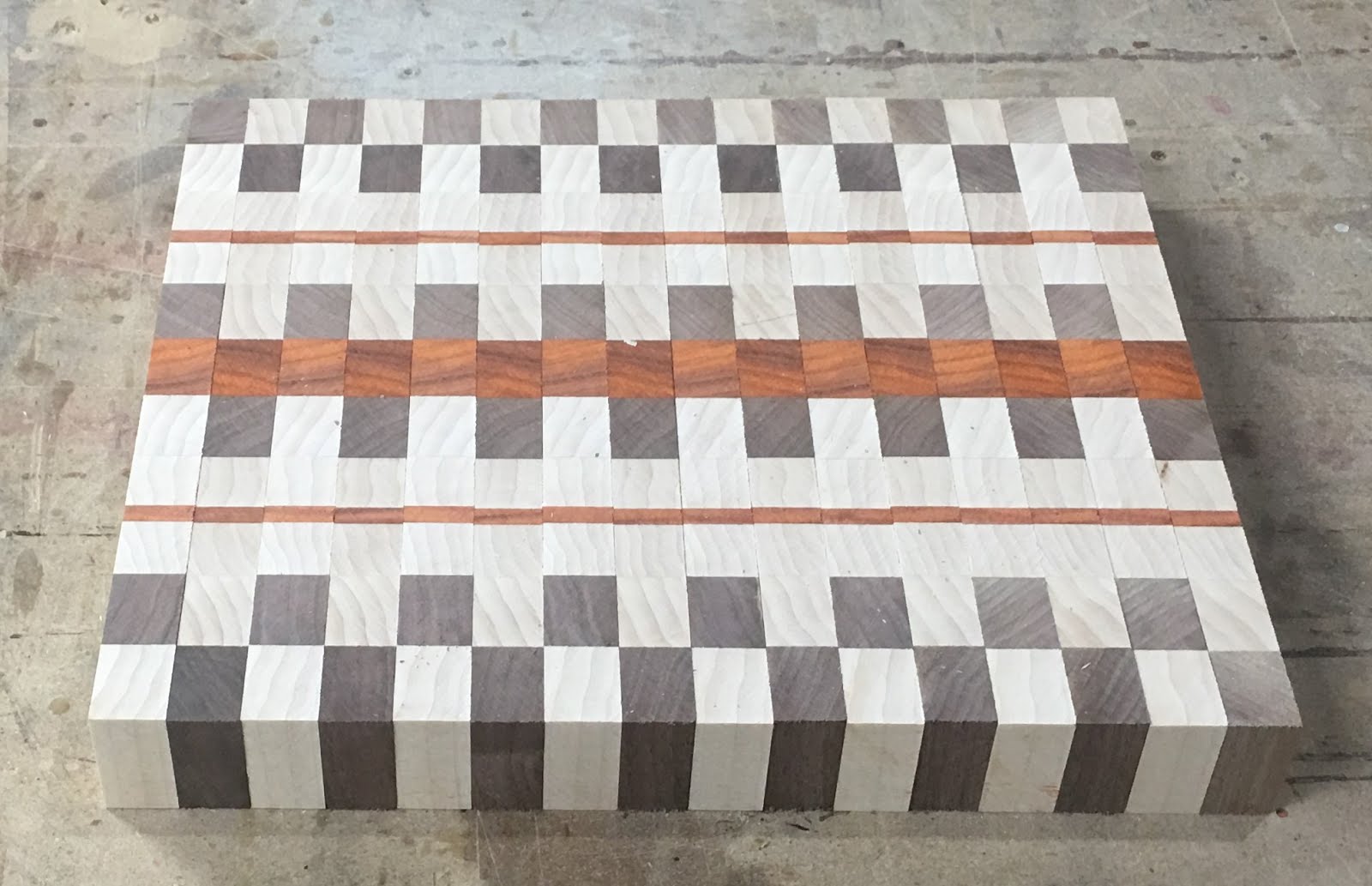 Lee decided to use his new jointer and some of the lumber he purchased to make a new end grain cutting board. He made a cutting board in the past that we used quite a bit but it got chopped up a bit too much. He used a program called cbdesigner available at www.lastalias.com/cbdesigner/ to design the cutting board. The wood he is using on the cutting board is hard maple, walnut and padauk.